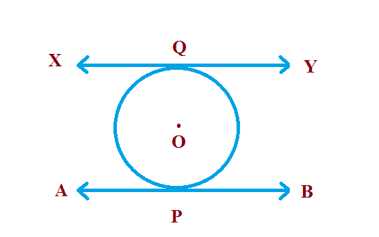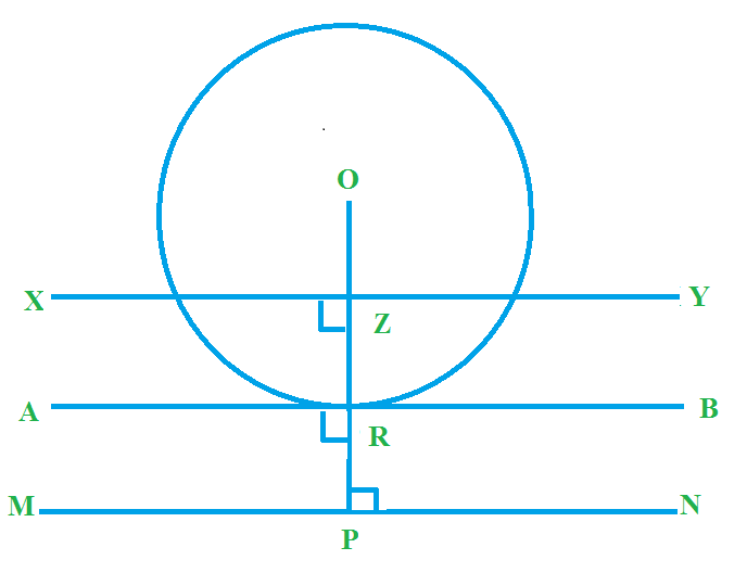 Here, AB is tangent to the circle having center O and parallel to line MN and line XY.