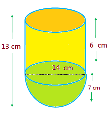 The height (h) of the cylinder is the total height of the vessel minus the height of the hemisphere: 13 cm− 7 cm = 6 cm.