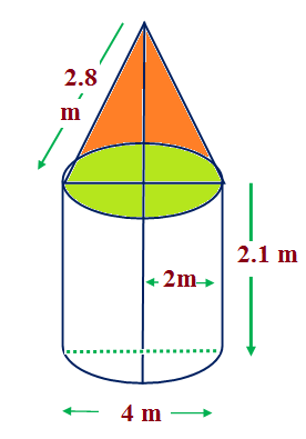 A tent is in the shape of a cylinder surmounted by a conical top. If the height and diameter of the cylindrical part are 2.1 m and 4 m respectively, and the slant height of the top is 2.8 m, find the area of the canvas used for making the tent. Also, find the cost of the canvas of the tent at the rate of Rs 500 per m2. (Note that the base of the tent will not be covered with canvas)