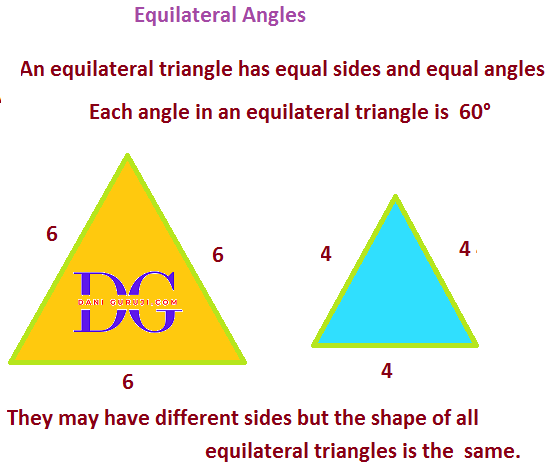 An equilateral triangle has equal sides and equal angles. All equilateral triangles are similar. Each angle in an equilateral triangle is 60°.