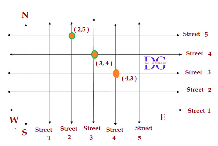 There are many cross- streets in your model. A particular cross-street is made by two streets, one running in the North – South direction and another in the East – West direction. Each cross street is referred to in the following manner: If the 2nd street running in the North – South direction and 5th in the East – West direction meet at some crossing, then we will call this cross-street (2, 5). Using this convention, find: