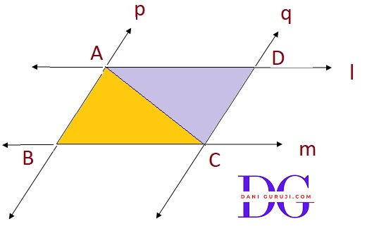 l and m are two parallel lines intersected by another pair of parallel lines p and q (see Fig.). Show that ΔABC $\cong$ ΔCDA